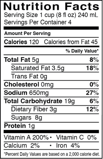 This product label shows that one serving (240 ml) of this soup contains 650 mg of sodium, which is 27% of the recommended daily value.